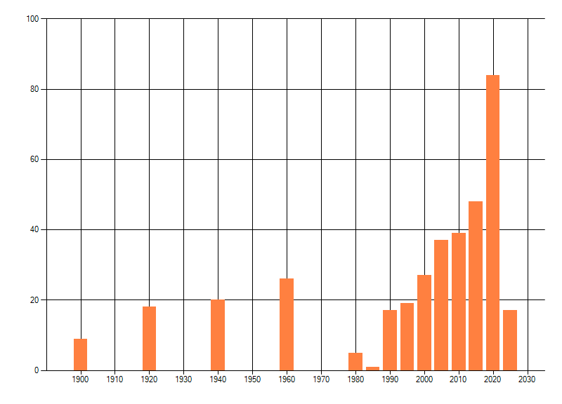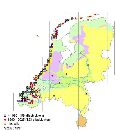 Het aantal atlasblokken (5x5 km) waarin de soort is gemeld binnen een periode van vijf jaar (vanaf 1980) of twintig jaar. Niet gecorrigeerd voor waarnemersinspanning en het aantal doorgegeven waarnemingen kan sterk variëren per periode, dus een trend in verspreiding kan hier niet direct uit worden afgelezen. Het opgegeven jaartal is het eerste jaar van de periode. Bron: gevalideerde waarnemingen uit de NDFF.
