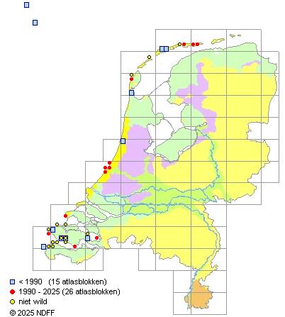 Het aantal atlasblokken (5x5 km) waarin de soort is gemeld binnen een periode van vijf jaar (vanaf 1980) of twintig jaar. Niet gecorrigeerd voor waarnemersinspanning en het aantal doorgegeven waarnemingen kan sterk variëren per periode, dus een trend in verspreiding kan hier niet direct uit worden afgelezen. Het opgegeven jaartal is het eerste jaar van de periode. Bron: gevalideerde waarnemingen uit de NDFF.