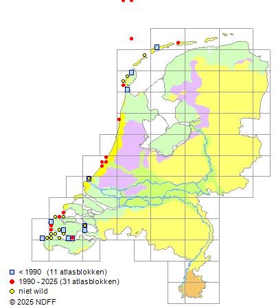 Het aantal atlasblokken (5x5 km) waarin de soort is gemeld binnen een periode van vijf jaar (vanaf 1980) of twintig jaar. Niet gecorrigeerd voor waarnemersinspanning en het aantal doorgegeven waarnemingen kan sterk variëren per periode, dus een trend in verspreiding kan hier niet direct uit worden afgelezen. Het opgegeven jaartal is het eerste jaar van de periode. Bron: gevalideerde waarnemingen uit de NDFF.