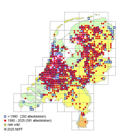 Het aantal atlasblokken (5x5 km) waarin de soort is gemeld binnen een periode van vijf jaar (vanaf 1980) of twintig jaar. Niet gecorrigeerd voor waarnemersinspanning en het aantal doorgegeven waarnemingen kan sterk variëren per periode, dus een trend in verspreiding kan hier niet direct uit worden afgelezen. Het opgegeven jaartal is het eerste jaar van de periode. Bron: gevalideerde waarnemingen uit de NDFF.