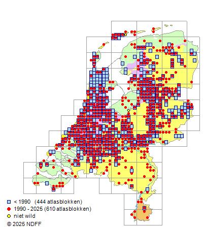Het aantal atlasblokken (5x5 km) waarin de soort is gemeld binnen een periode van vijf jaar (vanaf 1980) of twintig jaar. Niet gecorrigeerd voor waarnemersinspanning en het aantal doorgegeven waarnemingen kan sterk variëren per periode, dus een trend in verspreiding kan hier niet direct uit worden afgelezen. Het opgegeven jaartal is het eerste jaar van de periode. Bron: gevalideerde waarnemingen uit de NDFF.