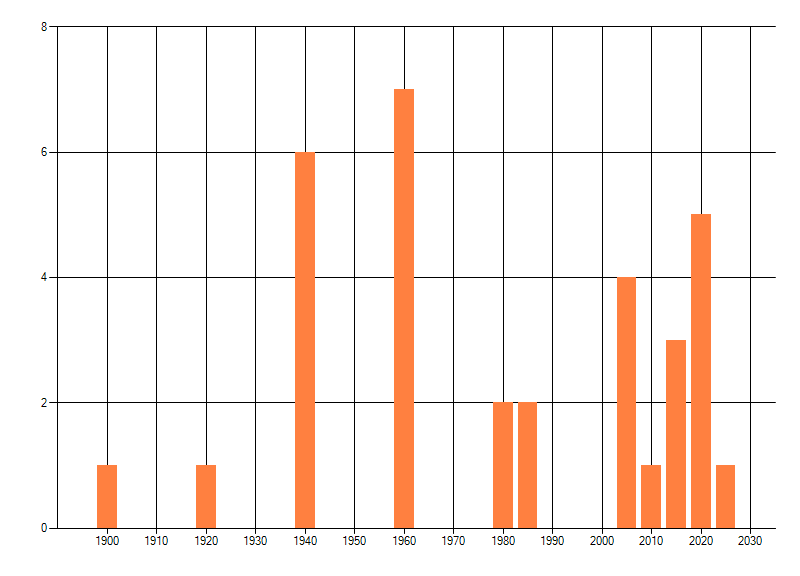 Het aantal atlasblokken (5x5 km) waarin de soort is gemeld binnen een periode van vijf jaar (vanaf 1980) of twintig jaar. Niet gecorrigeerd voor waarnemersinspanning en het aantal doorgegeven waarnemingen kan sterk variëren per periode, dus een trend in verspreiding kan hier niet direct uit worden afgelezen. Het opgegeven jaartal is het eerste jaar van de periode. Bron: gevalideerde waarnemingen uit de NDFF.