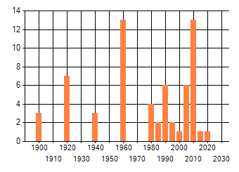 Het aantal atlasblokken (5x5 km) waarin de soort is gemeld binnen een periode van vijf jaar (vanaf 1980) of twintig jaar. Niet gecorrigeerd voor waarnemersinspanning en het aantal doorgegeven waarnemingen kan sterk variëren per periode, dus een trend in verspreiding kan hier niet direct uit worden afgelezen. Het opgegeven jaartal is het eerste jaar van de periode. Bron: gevalideerde waarnemingen uit de NDFF.
