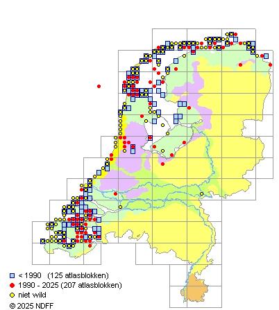 Het aantal atlasblokken (5x5 km) waarin de soort is gemeld binnen een periode van vijf jaar (vanaf 1980) of twintig jaar. Niet gecorrigeerd voor waarnemersinspanning en het aantal doorgegeven waarnemingen kan sterk variëren per periode, dus een trend in verspreiding kan hier niet direct uit worden afgelezen. Het opgegeven jaartal is het eerste jaar van de periode. Bron: gevalideerde waarnemingen uit de NDFF.