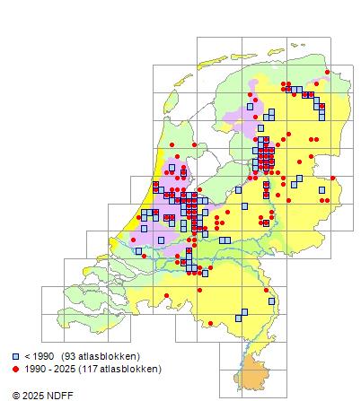 Het aantal atlasblokken (5x5 km) waarin de soort is gemeld binnen een periode van vijf jaar (vanaf 1980) of twintig jaar. Niet gecorrigeerd voor waarnemersinspanning en het aantal doorgegeven waarnemingen kan sterk variëren per periode, dus een trend in verspreiding kan hier niet direct uit worden afgelezen. Het opgegeven jaartal is het eerste jaar van de periode. Bron: gevalideerde waarnemingen uit de NDFF.