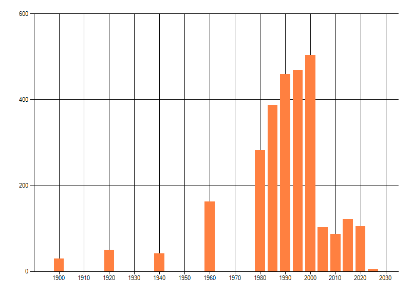 Het aantal atlasblokken (5x5 km) waarin de soort is gemeld binnen een periode van vijf jaar (vanaf 1980) of twintig jaar. Niet gecorrigeerd voor waarnemersinspanning en het aantal doorgegeven waarnemingen kan sterk variëren per periode, dus een trend in verspreiding kan hier niet direct uit worden afgelezen. Het opgegeven jaartal is het eerste jaar van de periode. Bron: gevalideerde waarnemingen uit de NDFF.