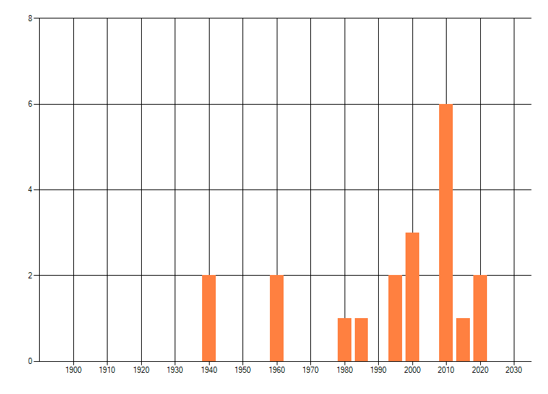 Het aantal atlasblokken (5x5 km) waarin de soort is gemeld binnen een periode van vijf jaar (vanaf 1980) of twintig jaar. Niet gecorrigeerd voor waarnemersinspanning en het aantal doorgegeven waarnemingen kan sterk variëren per periode, dus een trend in verspreiding kan hier niet direct uit worden afgelezen. Het opgegeven jaartal is het eerste jaar van de periode. Bron: gevalideerde waarnemingen uit de NDFF.