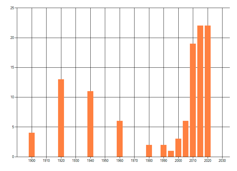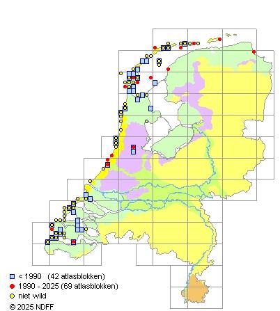 Het aantal atlasblokken (5x5 km) waarin de soort is gemeld binnen een periode van vijf jaar (vanaf 1980) of twintig jaar. Niet gecorrigeerd voor waarnemersinspanning en het aantal doorgegeven waarnemingen kan sterk variëren per periode, dus een trend in verspreiding kan hier niet direct uit worden afgelezen. Het opgegeven jaartal is het eerste jaar van de periode. Bron: gevalideerde waarnemingen uit de NDFF.