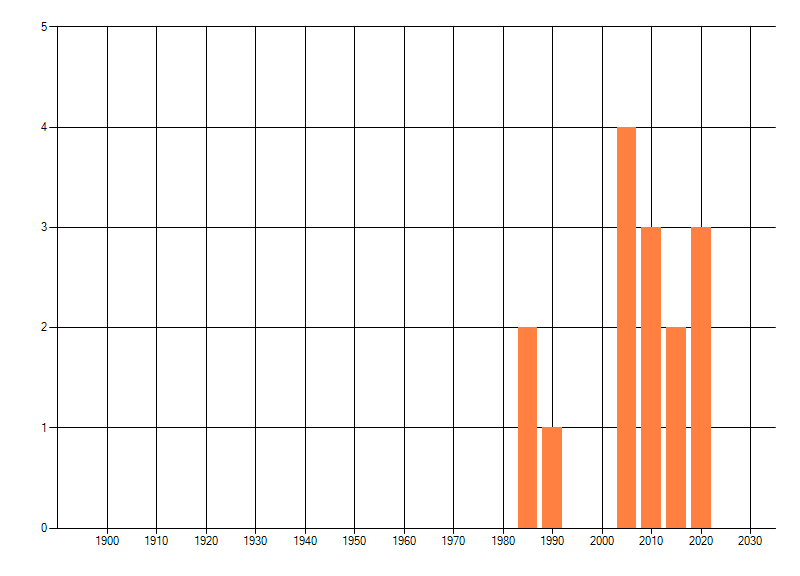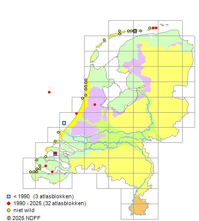Het aantal atlasblokken (5x5 km) waarin de soort is gemeld binnen een periode van vijf jaar (vanaf 1980) of twintig jaar. Niet gecorrigeerd voor waarnemersinspanning en het aantal doorgegeven waarnemingen kan sterk variëren per periode, dus een trend in verspreiding kan hier niet direct uit worden afgelezen. Het opgegeven jaartal is het eerste jaar van de periode. Bron: gevalideerde waarnemingen uit de NDFF.