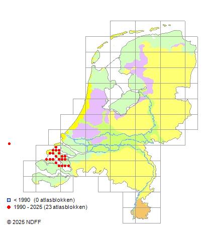 Het aantal atlasblokken (5x5 km) waarin de soort is gemeld binnen een periode van vijf jaar (vanaf 1980) of twintig jaar. Niet gecorrigeerd voor waarnemersinspanning en het aantal doorgegeven waarnemingen kan sterk variëren per periode, dus een trend in verspreiding kan hier niet direct uit worden afgelezen. Het opgegeven jaartal is het eerste jaar van de periode. Bron: gevalideerde waarnemingen uit de NDFF.