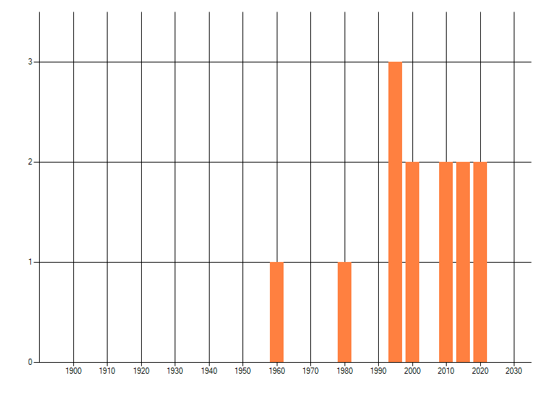 Het aantal atlasblokken (5x5 km) waarin de soort is gemeld binnen een periode van vijf jaar (vanaf 1980) of twintig jaar. Niet gecorrigeerd voor waarnemersinspanning en het aantal doorgegeven waarnemingen kan sterk variëren per periode, dus een trend in verspreiding kan hier niet direct uit worden afgelezen. Het opgegeven jaartal is het eerste jaar van de periode. Bron: gevalideerde waarnemingen uit de NDFF.