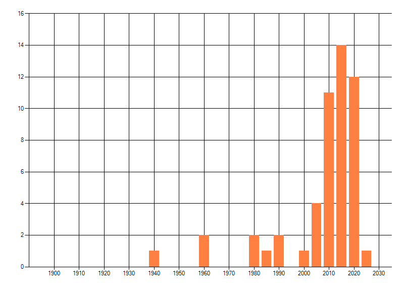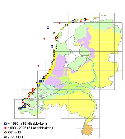 Het aantal atlasblokken (5x5 km) waarin de soort is gemeld binnen een periode van vijf jaar (vanaf 1980) of twintig jaar. Niet gecorrigeerd voor waarnemersinspanning en het aantal doorgegeven waarnemingen kan sterk variëren per periode, dus een trend in verspreiding kan hier niet direct uit worden afgelezen. Het opgegeven jaartal is het eerste jaar van de periode. Bron: gevalideerde waarnemingen uit de NDFF.