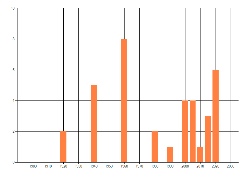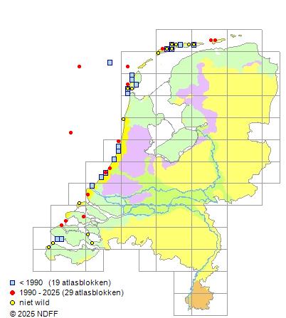 Het aantal atlasblokken (5x5 km) waarin de soort is gemeld binnen een periode van vijf jaar (vanaf 1980) of twintig jaar. Niet gecorrigeerd voor waarnemersinspanning en het aantal doorgegeven waarnemingen kan sterk variëren per periode, dus een trend in verspreiding kan hier niet direct uit worden afgelezen. Het opgegeven jaartal is het eerste jaar van de periode. Bron: gevalideerde waarnemingen uit de NDFF.
