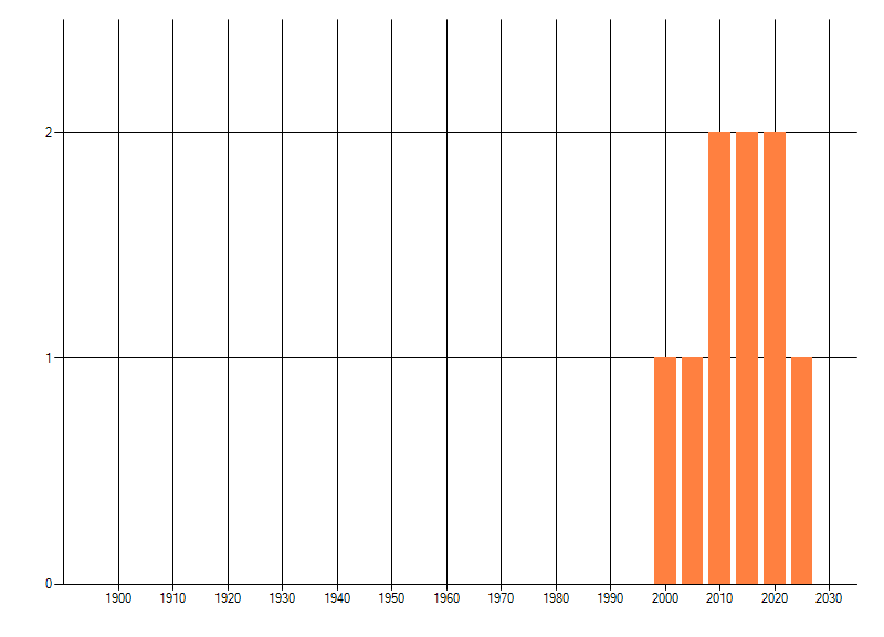 Het aantal atlasblokken (5x5 km) waarin de soort is gemeld binnen een periode van vijf jaar (vanaf 1980) of twintig jaar. Niet gecorrigeerd voor waarnemersinspanning en het aantal doorgegeven waarnemingen kan sterk variëren per periode, dus een trend in verspreiding kan hier niet direct uit worden afgelezen. Het opgegeven jaartal is het eerste jaar van de periode. Bron: gevalideerde waarnemingen uit de NDFF.