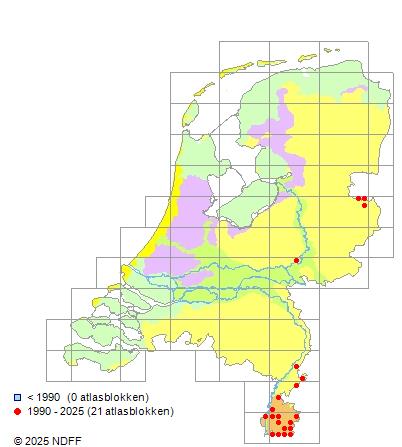 Het aantal atlasblokken (5x5 km) waarin de soort is gemeld binnen een periode van vijf jaar (vanaf 1980) of twintig jaar. Niet gecorrigeerd voor waarnemersinspanning en het aantal doorgegeven waarnemingen kan sterk variëren per periode, dus een trend in verspreiding kan hier niet direct uit worden afgelezen. Het opgegeven jaartal is het eerste jaar van de periode. Bron: gevalideerde waarnemingen uit de NDFF.