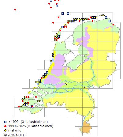 Het aantal atlasblokken (5x5 km) waarin de soort is gemeld binnen een periode van vijf jaar (vanaf 1980) of twintig jaar. Niet gecorrigeerd voor waarnemersinspanning en het aantal doorgegeven waarnemingen kan sterk variëren per periode, dus een trend in verspreiding kan hier niet direct uit worden afgelezen. Het opgegeven jaartal is het eerste jaar van de periode. Bron: gevalideerde waarnemingen uit de NDFF.
