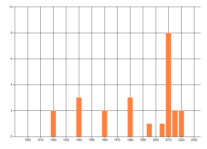 Het aantal atlasblokken (5x5 km) waarin de soort is gemeld binnen een periode van vijf jaar (vanaf 1980) of twintig jaar. Niet gecorrigeerd voor waarnemersinspanning en het aantal doorgegeven waarnemingen kan sterk variëren per periode, dus een trend in verspreiding kan hier niet direct uit worden afgelezen. Het opgegeven jaartal is het eerste jaar van de periode. Bron: gevalideerde waarnemingen uit de NDFF.