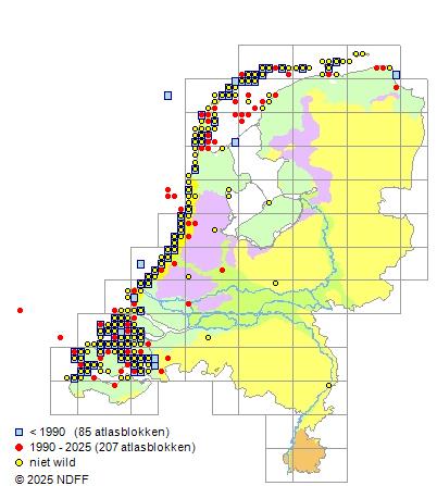 Het aantal atlasblokken (5x5 km) waarin de soort is gemeld binnen een periode van vijf jaar (vanaf 1980) of twintig jaar. Niet gecorrigeerd voor waarnemersinspanning en het aantal doorgegeven waarnemingen kan sterk variëren per periode, dus een trend in verspreiding kan hier niet direct uit worden afgelezen. Het opgegeven jaartal is het eerste jaar van de periode. Bron: gevalideerde waarnemingen uit de NDFF.