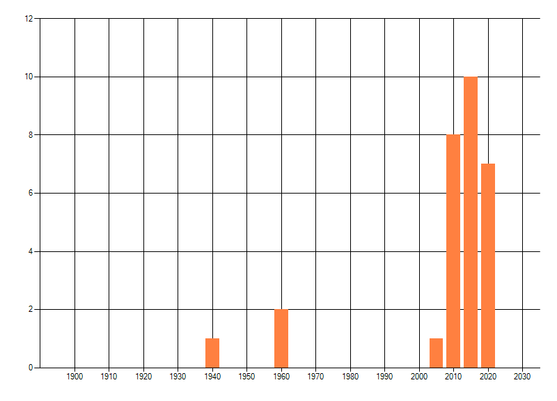 Het aantal atlasblokken (5x5 km) waarin de soort is gemeld binnen een periode van vijf jaar (vanaf 1980) of twintig jaar. Niet gecorrigeerd voor waarnemersinspanning en het aantal doorgegeven waarnemingen kan sterk variëren per periode, dus een trend in verspreiding kan hier niet direct uit worden afgelezen. Het opgegeven jaartal is het eerste jaar van de periode. Bron: gevalideerde waarnemingen uit de NDFF.