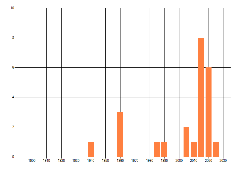 Het aantal atlasblokken (5x5 km) waarin de soort is gemeld binnen een periode van vijf jaar (vanaf 1980) of twintig jaar. Niet gecorrigeerd voor waarnemersinspanning en het aantal doorgegeven waarnemingen kan sterk variëren per periode, dus een trend in verspreiding kan hier niet direct uit worden afgelezen. Het opgegeven jaartal is het eerste jaar van de periode. Bron: gevalideerde waarnemingen uit de NDFF.