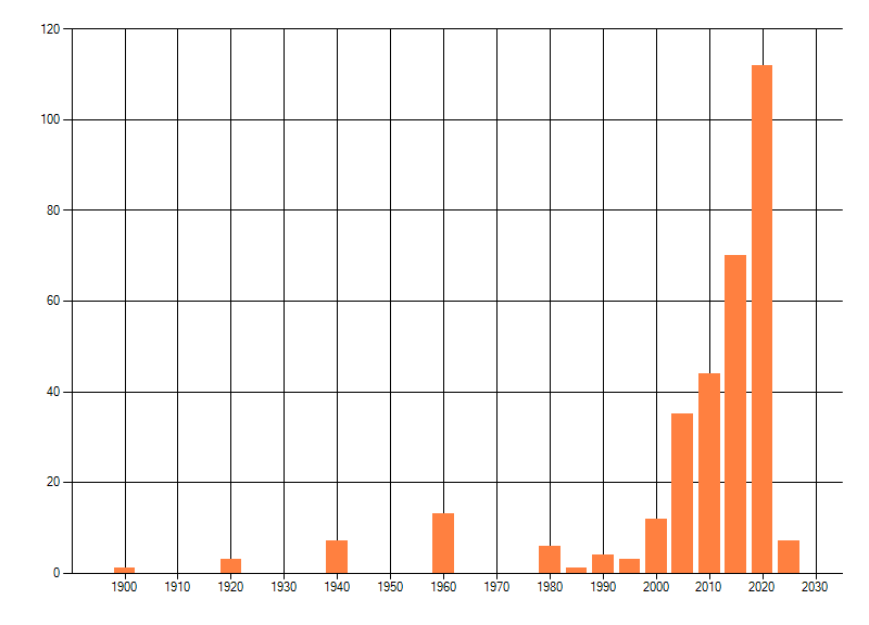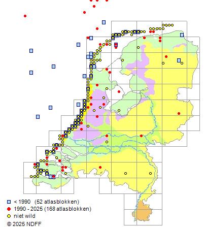 Het aantal atlasblokken (5x5 km) waarin de soort is gemeld binnen een periode van vijf jaar (vanaf 1980) of twintig jaar. Niet gecorrigeerd voor waarnemersinspanning en het aantal doorgegeven waarnemingen kan sterk variëren per periode, dus een trend in verspreiding kan hier niet direct uit worden afgelezen. Het opgegeven jaartal is het eerste jaar van de periode. Bron: gevalideerde waarnemingen uit de NDFF.