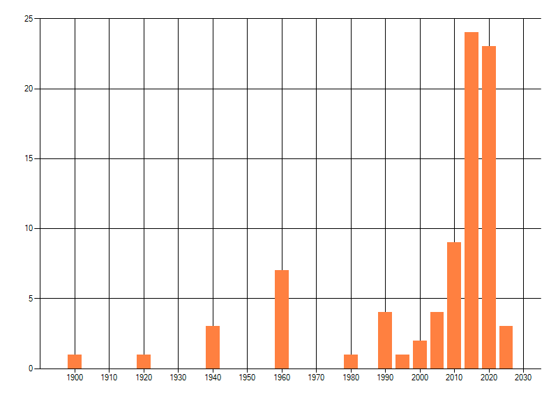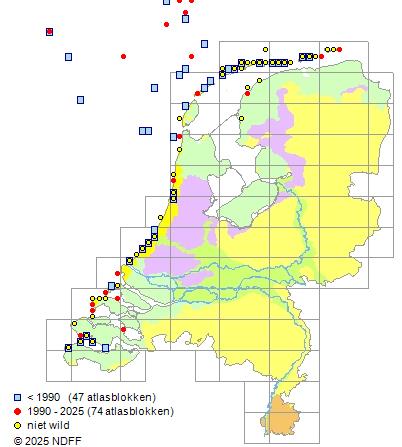 Het aantal atlasblokken (5x5 km) waarin de soort is gemeld binnen een periode van vijf jaar (vanaf 1980) of twintig jaar. Niet gecorrigeerd voor waarnemersinspanning en het aantal doorgegeven waarnemingen kan sterk variëren per periode, dus een trend in verspreiding kan hier niet direct uit worden afgelezen. Het opgegeven jaartal is het eerste jaar van de periode. Bron: gevalideerde waarnemingen uit de NDFF.