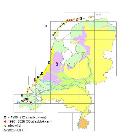 Het aantal atlasblokken (5x5 km) waarin de soort is gemeld binnen een periode van vijf jaar (vanaf 1980) of twintig jaar. Niet gecorrigeerd voor waarnemersinspanning en het aantal doorgegeven waarnemingen kan sterk variëren per periode, dus een trend in verspreiding kan hier niet direct uit worden afgelezen. Het opgegeven jaartal is het eerste jaar van de periode. Bron: gevalideerde waarnemingen uit de NDFF.