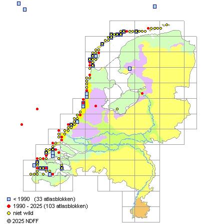 Het aantal atlasblokken (5x5 km) waarin de soort is gemeld binnen een periode van vijf jaar (vanaf 1980) of twintig jaar. Niet gecorrigeerd voor waarnemersinspanning en het aantal doorgegeven waarnemingen kan sterk variëren per periode, dus een trend in verspreiding kan hier niet direct uit worden afgelezen. Het opgegeven jaartal is het eerste jaar van de periode. Bron: gevalideerde waarnemingen uit de NDFF.