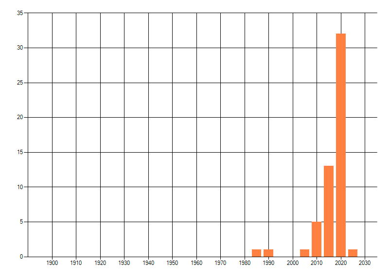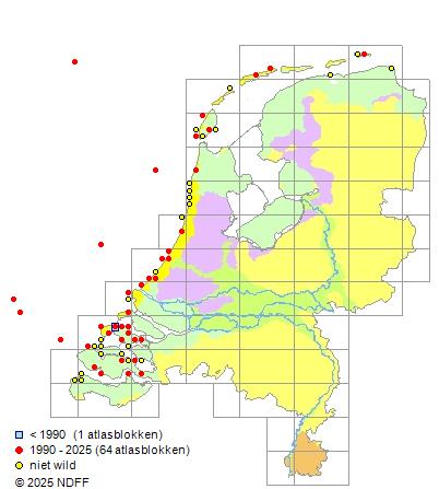 Het aantal atlasblokken (5x5 km) waarin de soort is gemeld binnen een periode van vijf jaar (vanaf 1980) of twintig jaar. Niet gecorrigeerd voor waarnemersinspanning en het aantal doorgegeven waarnemingen kan sterk variëren per periode, dus een trend in verspreiding kan hier niet direct uit worden afgelezen. Het opgegeven jaartal is het eerste jaar van de periode. Bron: gevalideerde waarnemingen uit de NDFF.