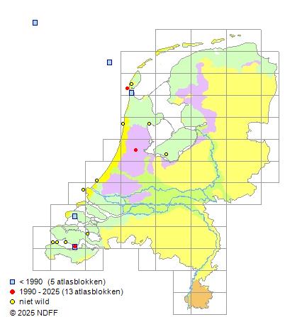 Het aantal atlasblokken (5x5 km) waarin de soort is gemeld binnen een periode van vijf jaar (vanaf 1980) of twintig jaar. Niet gecorrigeerd voor waarnemersinspanning en het aantal doorgegeven waarnemingen kan sterk variëren per periode, dus een trend in verspreiding kan hier niet direct uit worden afgelezen. Het opgegeven jaartal is het eerste jaar van de periode. Bron: gevalideerde waarnemingen uit de NDFF.