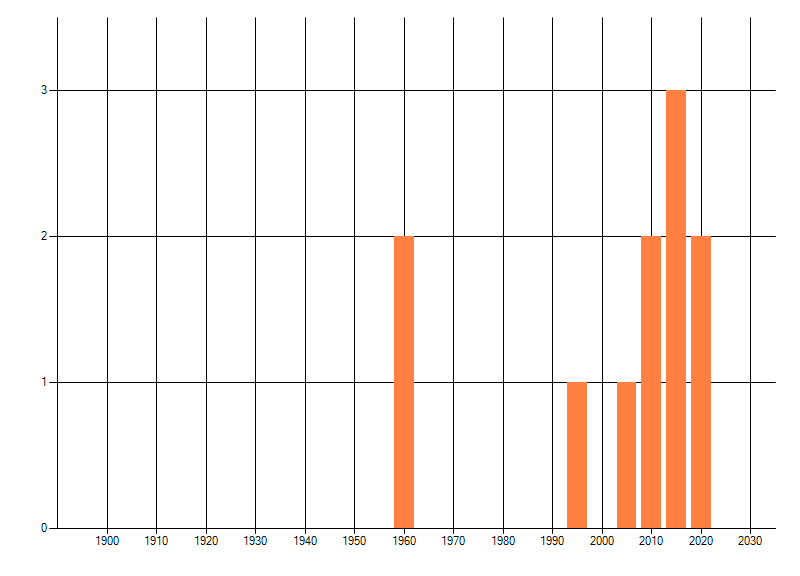 Het aantal atlasblokken (5x5 km) waarin de soort is gemeld binnen een periode van vijf jaar (vanaf 1980) of twintig jaar. Niet gecorrigeerd voor waarnemersinspanning en het aantal doorgegeven waarnemingen kan sterk variëren per periode, dus een trend in verspreiding kan hier niet direct uit worden afgelezen. Het opgegeven jaartal is het eerste jaar van de periode. Bron: gevalideerde waarnemingen uit de NDFF.