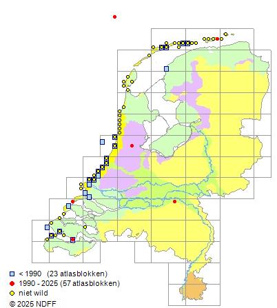 Het aantal atlasblokken (5x5 km) waarin de soort is gemeld binnen een periode van vijf jaar (vanaf 1980) of twintig jaar. Niet gecorrigeerd voor waarnemersinspanning en het aantal doorgegeven waarnemingen kan sterk variëren per periode, dus een trend in verspreiding kan hier niet direct uit worden afgelezen. Het opgegeven jaartal is het eerste jaar van de periode. Bron: gevalideerde waarnemingen uit de NDFF.