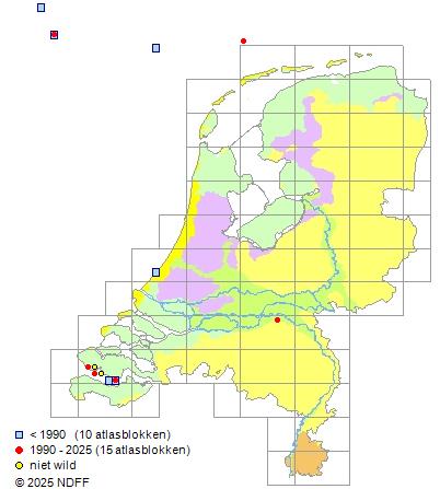 Het aantal atlasblokken (5x5 km) waarin de soort is gemeld binnen een periode van vijf jaar (vanaf 1980) of twintig jaar. Niet gecorrigeerd voor waarnemersinspanning en het aantal doorgegeven waarnemingen kan sterk variëren per periode, dus een trend in verspreiding kan hier niet direct uit worden afgelezen. Het opgegeven jaartal is het eerste jaar van de periode. Bron: gevalideerde waarnemingen uit de NDFF.