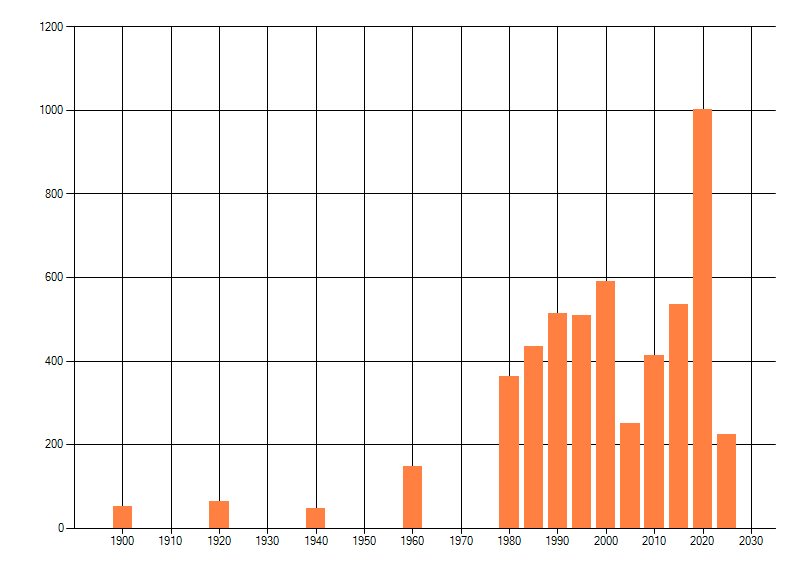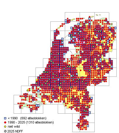 Het aantal atlasblokken (5x5 km) waarin de soort is gemeld binnen een periode van vijf jaar (vanaf 1980) of twintig jaar. Niet gecorrigeerd voor waarnemersinspanning en het aantal doorgegeven waarnemingen kan sterk variƫren per periode, dus een trend in verspreiding kan hier niet direct uit worden afgelezen. Het opgegeven jaartal is het eerste jaar van de periode. Bron: gevalideerde waarnemingen uit de NDFF.