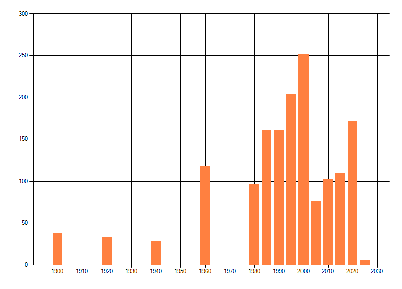 Het aantal atlasblokken (5x5 km) waarin de soort is gemeld binnen een periode van vijf jaar (vanaf 1980) of twintig jaar. Niet gecorrigeerd voor waarnemersinspanning en het aantal doorgegeven waarnemingen kan sterk variëren per periode, dus een trend in verspreiding kan hier niet direct uit worden afgelezen. Het opgegeven jaartal is het eerste jaar van de periode. Bron: gevalideerde waarnemingen uit de NDFF.