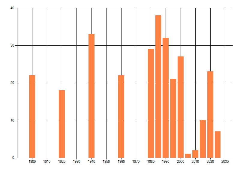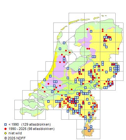 Het aantal atlasblokken (5x5 km) waarin de soort is gemeld binnen een periode van vijf jaar (vanaf 1980) of twintig jaar. Niet gecorrigeerd voor waarnemersinspanning en het aantal doorgegeven waarnemingen kan sterk variëren per periode, dus een trend in verspreiding kan hier niet direct uit worden afgelezen. Het opgegeven jaartal is het eerste jaar van de periode. Bron: gevalideerde waarnemingen uit de NDFF.