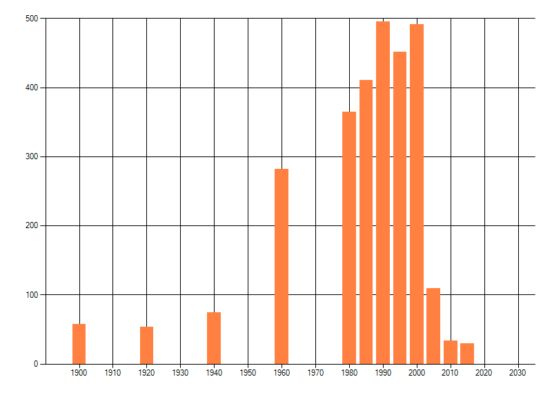 Het aantal atlasblokken (5x5 km) waarin de soort is gemeld binnen een periode van vijf jaar (vanaf 1980) of twintig jaar. Niet gecorrigeerd voor waarnemersinspanning en het aantal doorgegeven waarnemingen kan sterk variëren per periode, dus een trend in verspreiding kan hier niet direct uit worden afgelezen. Het opgegeven jaartal is het eerste jaar van de periode. Bron: gevalideerde waarnemingen uit de NDFF.