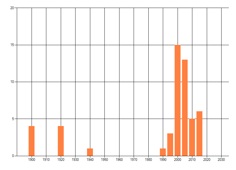 Het aantal atlasblokken (5x5 km) waarin de soort is gemeld binnen een periode van vijf jaar (vanaf 1980) of twintig jaar. Niet gecorrigeerd voor waarnemersinspanning en het aantal doorgegeven waarnemingen kan sterk variëren per periode, dus een trend in verspreiding kan hier niet direct uit worden afgelezen. Het opgegeven jaartal is het eerste jaar van de periode. Bron: gevalideerde waarnemingen uit de NDFF.