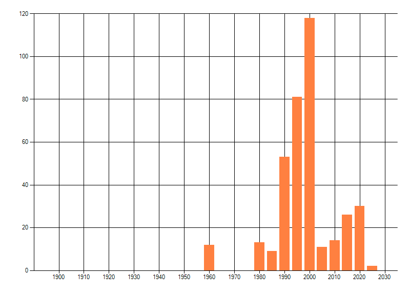 Het aantal atlasblokken (5x5 km) waarin de soort is gemeld binnen een periode van vijf jaar (vanaf 1980) of twintig jaar. Niet gecorrigeerd voor waarnemersinspanning en het aantal doorgegeven waarnemingen kan sterk variëren per periode, dus een trend in verspreiding kan hier niet direct uit worden afgelezen. Het opgegeven jaartal is het eerste jaar van de periode. Bron: gevalideerde waarnemingen uit de NDFF.