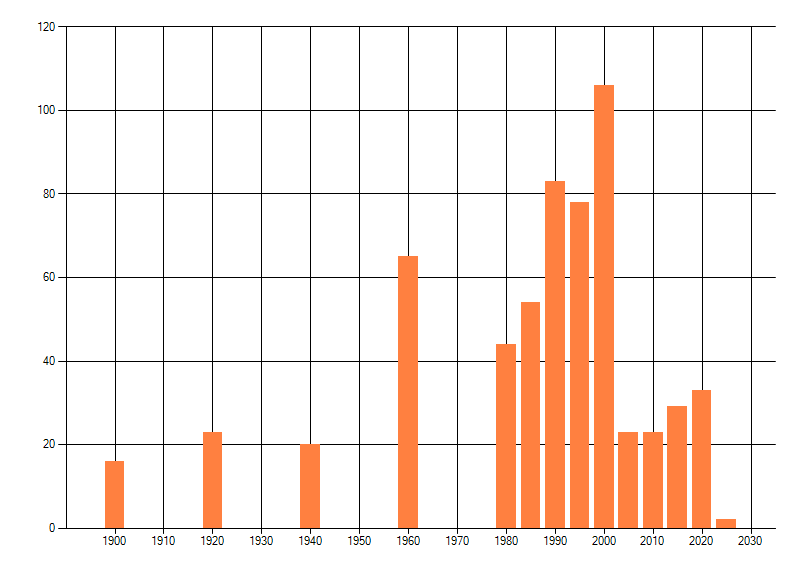 Het aantal atlasblokken (5x5 km) waarin de soort is gemeld binnen een periode van vijf jaar (vanaf 1980) of twintig jaar. Niet gecorrigeerd voor waarnemersinspanning en het aantal doorgegeven waarnemingen kan sterk variëren per periode, dus een trend in verspreiding kan hier niet direct uit worden afgelezen. Het opgegeven jaartal is het eerste jaar van de periode. Bron: gevalideerde waarnemingen uit de NDFF.