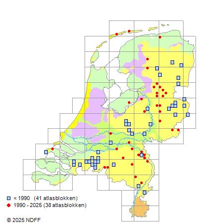 Het aantal atlasblokken (5x5 km) waarin de soort is gemeld binnen een periode van vijf jaar (vanaf 1980) of twintig jaar. Niet gecorrigeerd voor waarnemersinspanning en het aantal doorgegeven waarnemingen kan sterk variëren per periode, dus een trend in verspreiding kan hier niet direct uit worden afgelezen. Het opgegeven jaartal is het eerste jaar van de periode. Bron: gevalideerde waarnemingen uit de NDFF.