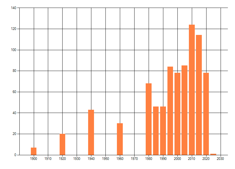 Het aantal atlasblokken (5x5 km) waarin de soort is gemeld binnen een periode van vijf jaar (vanaf 1980) of twintig jaar. Niet gecorrigeerd voor waarnemersinspanning en het aantal doorgegeven waarnemingen kan sterk variëren per periode, dus een trend in verspreiding kan hier niet direct uit worden afgelezen. Het opgegeven jaartal is het eerste jaar van de periode. Bron: gevalideerde waarnemingen uit de NDFF.