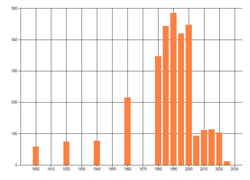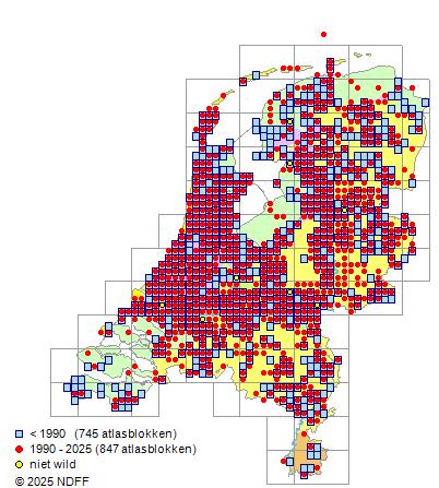 Het aantal atlasblokken (5x5 km) waarin de soort is gemeld binnen een periode van vijf jaar (vanaf 1980) of twintig jaar. Niet gecorrigeerd voor waarnemersinspanning en het aantal doorgegeven waarnemingen kan sterk variëren per periode, dus een trend in verspreiding kan hier niet direct uit worden afgelezen. Het opgegeven jaartal is het eerste jaar van de periode. Bron: gevalideerde waarnemingen uit de NDFF.