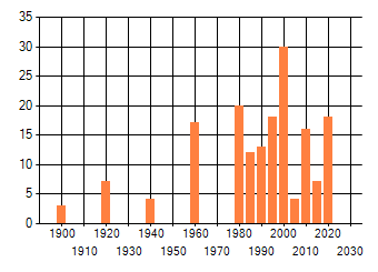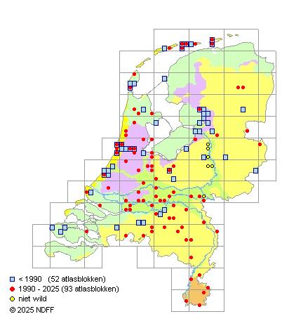 Het aantal atlasblokken (5x5 km) waarin de soort is gemeld binnen een periode van vijf jaar (vanaf 1980) of twintig jaar. Niet gecorrigeerd voor waarnemersinspanning en het aantal doorgegeven waarnemingen kan sterk variëren per periode, dus een trend in verspreiding kan hier niet direct uit worden afgelezen. Het opgegeven jaartal is het eerste jaar van de periode. Bron: gevalideerde waarnemingen uit de NDFF.