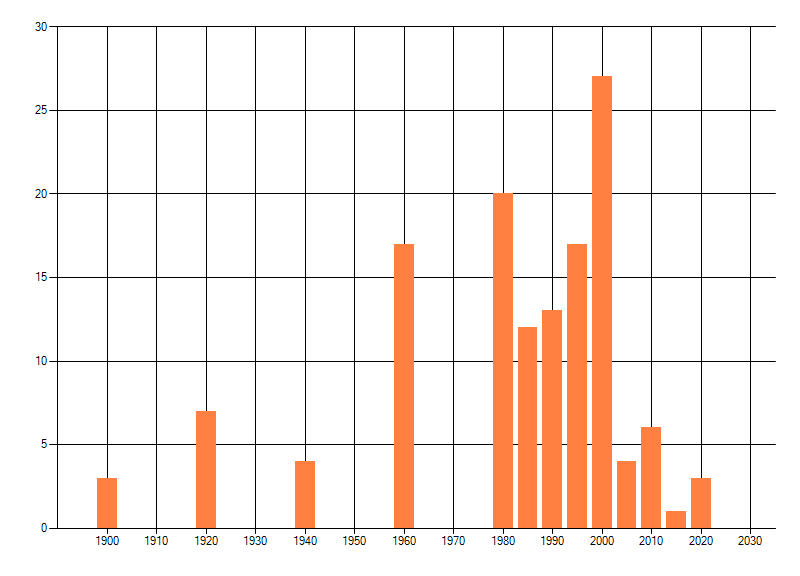 Het aantal atlasblokken (5x5 km) waarin de soort is gemeld binnen een periode van vijf jaar (vanaf 1980) of twintig jaar. Niet gecorrigeerd voor waarnemersinspanning en het aantal doorgegeven waarnemingen kan sterk variëren per periode, dus een trend in verspreiding kan hier niet direct uit worden afgelezen. Het opgegeven jaartal is het eerste jaar van de periode. Bron: gevalideerde waarnemingen uit de NDFF.