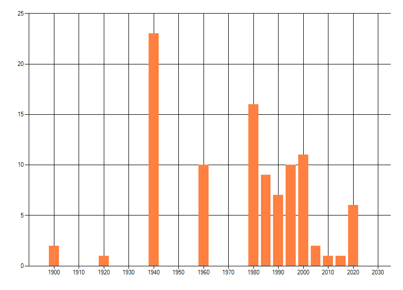 Het aantal atlasblokken (5x5 km) waarin de soort is gemeld binnen een periode van vijf jaar (vanaf 1980) of twintig jaar. Niet gecorrigeerd voor waarnemersinspanning en het aantal doorgegeven waarnemingen kan sterk variëren per periode, dus een trend in verspreiding kan hier niet direct uit worden afgelezen. Het opgegeven jaartal is het eerste jaar van de periode. Bron: gevalideerde waarnemingen uit de NDFF.