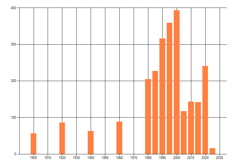 Het aantal atlasblokken (5x5 km) waarin de soort is gemeld binnen een periode van vijf jaar (vanaf 1980) of twintig jaar. Niet gecorrigeerd voor waarnemersinspanning en het aantal doorgegeven waarnemingen kan sterk variëren per periode, dus een trend in verspreiding kan hier niet direct uit worden afgelezen. Het opgegeven jaartal is het eerste jaar van de periode. Bron: gevalideerde waarnemingen uit de NDFF.