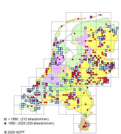 Het aantal atlasblokken (5x5 km) waarin de soort is gemeld binnen een periode van vijf jaar (vanaf 1980) of twintig jaar. Niet gecorrigeerd voor waarnemersinspanning en het aantal doorgegeven waarnemingen kan sterk variëren per periode, dus een trend in verspreiding kan hier niet direct uit worden afgelezen. Het opgegeven jaartal is het eerste jaar van de periode. Bron: gevalideerde waarnemingen uit de NDFF.