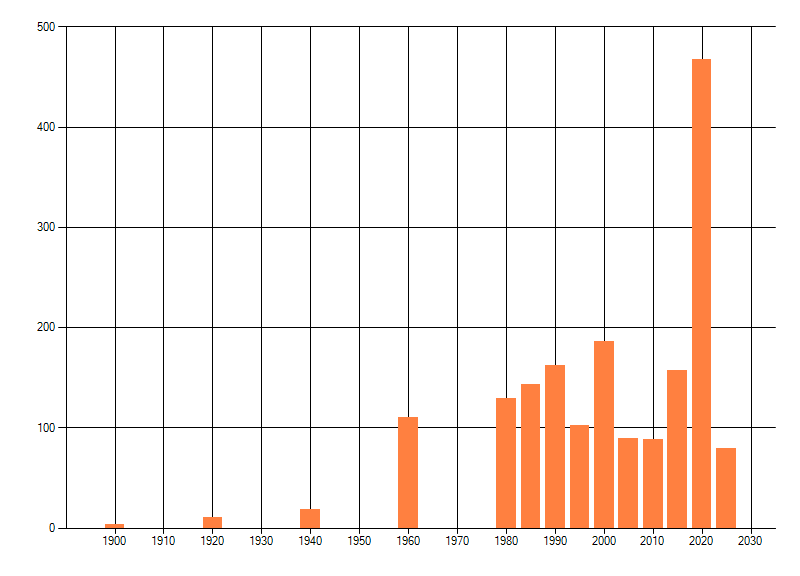 Het aantal atlasblokken (5x5 km) waarin de soort is gemeld binnen een periode van vijf jaar (vanaf 1980) of twintig jaar. Niet gecorrigeerd voor waarnemersinspanning en het aantal doorgegeven waarnemingen kan sterk variëren per periode, dus een trend in verspreiding kan hier niet direct uit worden afgelezen. Het opgegeven jaartal is het eerste jaar van de periode. Bron: gevalideerde waarnemingen uit de NDFF.