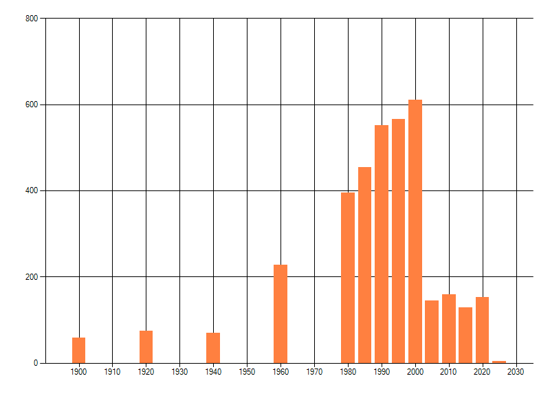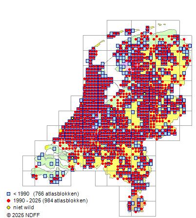 Het aantal atlasblokken (5x5 km) waarin de soort is gemeld binnen een periode van vijf jaar (vanaf 1980) of twintig jaar. Niet gecorrigeerd voor waarnemersinspanning en het aantal doorgegeven waarnemingen kan sterk variëren per periode, dus een trend in verspreiding kan hier niet direct uit worden afgelezen. Het opgegeven jaartal is het eerste jaar van de periode. Bron: gevalideerde waarnemingen uit de NDFF.